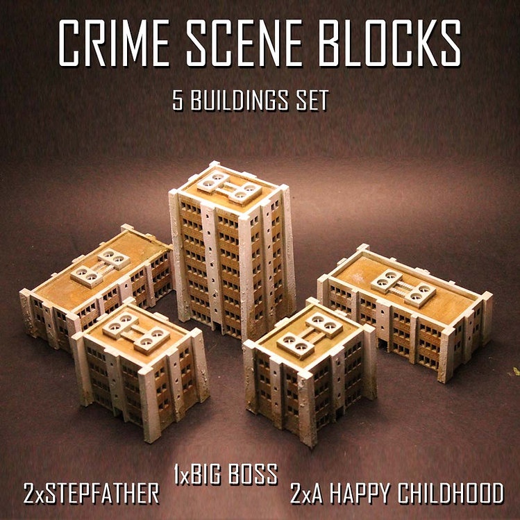 Crime Scene blocks contains 5 buildings. They are lasercut from 3mm MDF