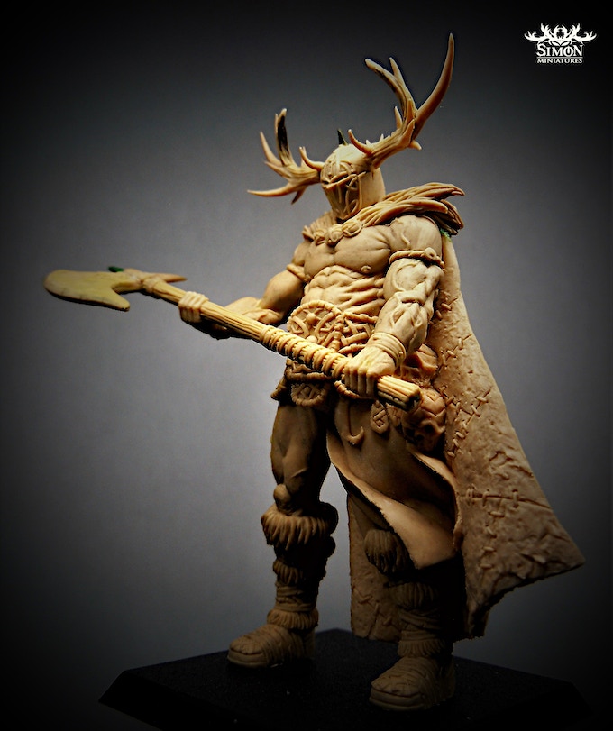 KAYN(75 mm) is the new miniature for my range: SIMONMINIATURES.COM. He is the divine incarnation for the Barbarian clan. A divine incarnation is the incarnation of the player in my future skirmish game. He leads his troops on the battlefield. Kayn joins the other deities: Belius, Etzebeth, Scarlet Goddess and Bathory, one for each faction.