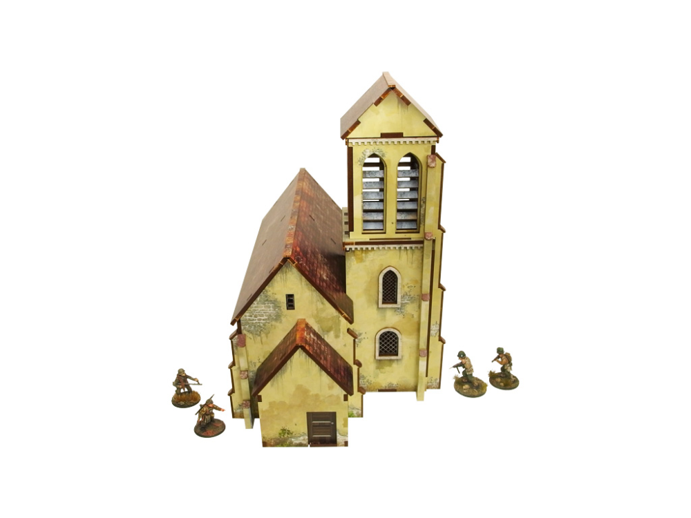 Multicolor prepainted (UV-printed) WW2 Normandy Church building with accessible colorful interior and removable roofs. The bell tower is a separate piece and is the iconic spotter or sniper spot. Pre-cut acrylic transparent window panels included. Option to assemble with open or closed doors.