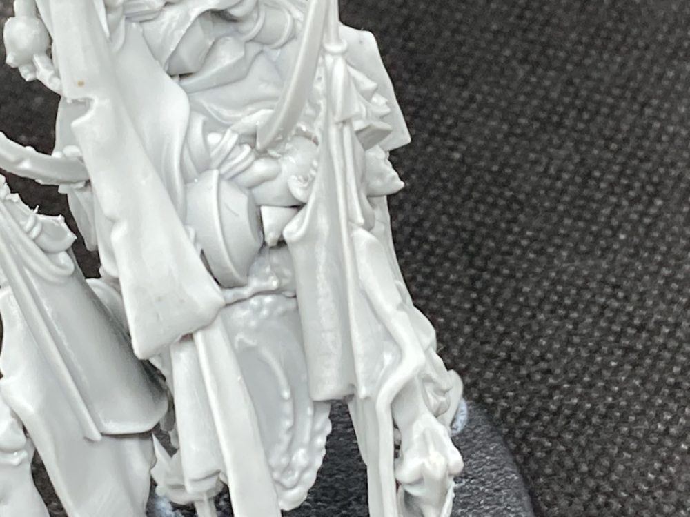 Die Qualität des Resins war in unseren Augen gut bis sehr gut, besonders da Forge World in der Vergangenheit hier nicht immer konstante Qualität abgeliefert hat. Das Material wirkte nicht spröde, es hätte an ein paar Stellen aber auch gerne etwas weicher sein können, was die Flexibilität beim Zusammenbau angeht. Ansonsten sind die Details scharf gegossen und gut zu erkennen gewesen. Es war nur ein sehr kleiner Lufteinschluss vorhanden und das Entfernen der Häutchen an einigen Stellen sowie das Anpassen der Beine auf dem Base hat beim Zusammenbau etwas Nerven gekostet.