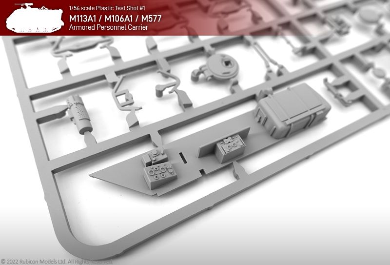 Our first Weekend Teaser for July… Our first M113A1 plastic test shots! A total of 6 sprues covering 3 variants of the M113A1 APC, plus the M106 mortar carrier and the M577 command vehicle; all with figures.Take a closer look at the details and you will be amazed at what we have done with this kit… highly detailed track links, road wheels, and with interior too! We will do some engineering inspections followed by a fitting test. Will take and post some assembled photos for you later.