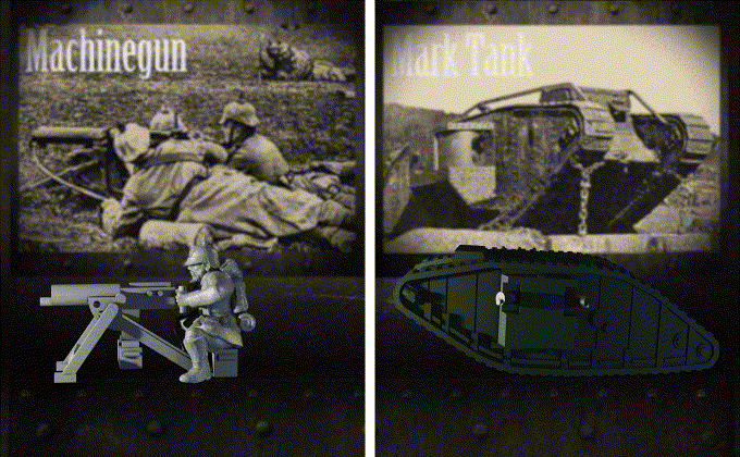 82 detailed miniatures including infantry, cavalry, howitzers, mortars, planes, tanks, armored cars, etc.