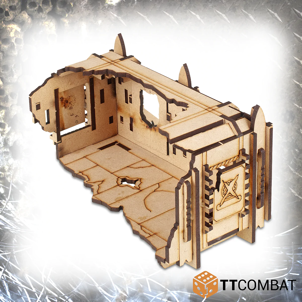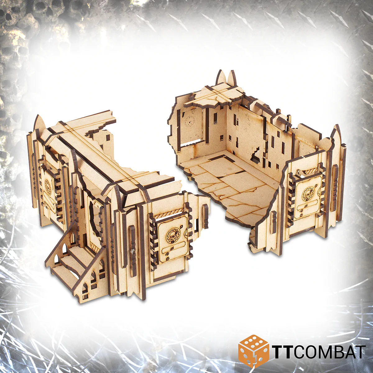 The Ruined Mecharium Research Pods is a kit fit for both narrative and competitive play. Designed for the Sci Fi – Gothic range. It features plenty of line of sighting blocking as well as flat roof spaces for models to gain a vantage from, alongside this the interior of the kit is fully playable as well as being able to combine together to make one larger ruin.