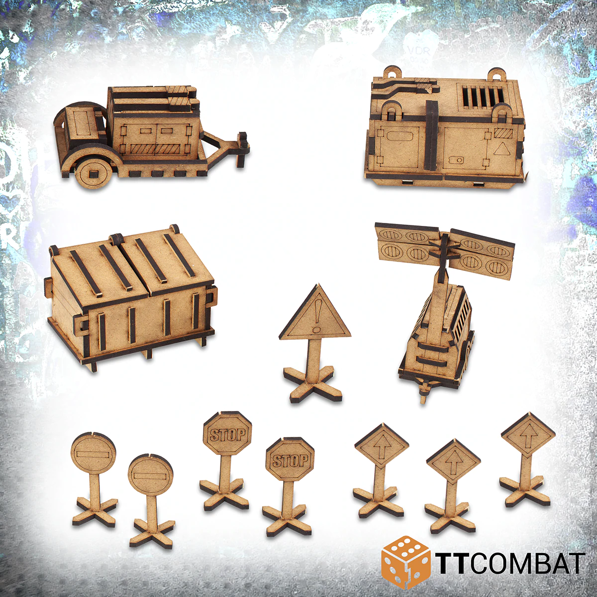 The Construction Yard Accessories kit is perfect for padding out your current table top. Does your scenery need a bit more realism? A few more lived-in conditions? A bit more convincing that it’s actually suitable to protect your troops? Look no further. These accessories can provide loads of line of sight blockers, actual cover and just add a lot more detail to your already turbulent table top scenery set up.