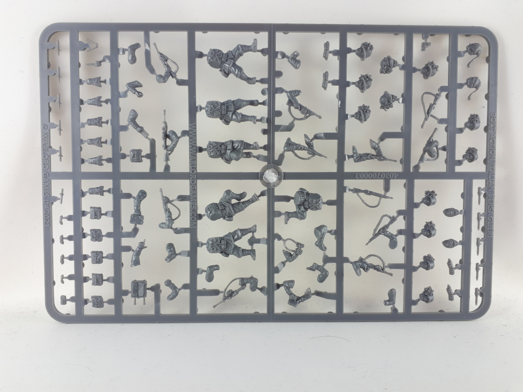 Die kleine Box beinhaltet einen Trupp bestehend aus einem NCO, einem zwei Mann umfassenden LMG-Team und sieben Soldaten mit Gewehren. Bis auf die beiden Modelle des LMG-Teams sind alle Figuren aus einem Guss und müssen lediglich auf die Bases geklebt werden. Optionen gibt es hier nicht.