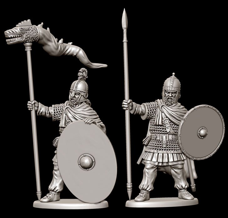 This set is coming along beautifully!Here we have some renders of the second Late Roman command figure from our upcoming armoured Late Roman set.The figure has the options to be a standard bearer, Centurion, Chieftain or spearman. He has head options for Late Roman, Goth, Romano British or Early Saxon. Note the metal face mask applied to a Roman helmet on the end figure with Vexilum.A musician is being worked on at present and we hope to have this set finished and off to the tooling queue in a few weeks and then we move on to Late Roman cavalry with lots of head variants so you can make them in to Goth/Germanic or Romano British cavalry.