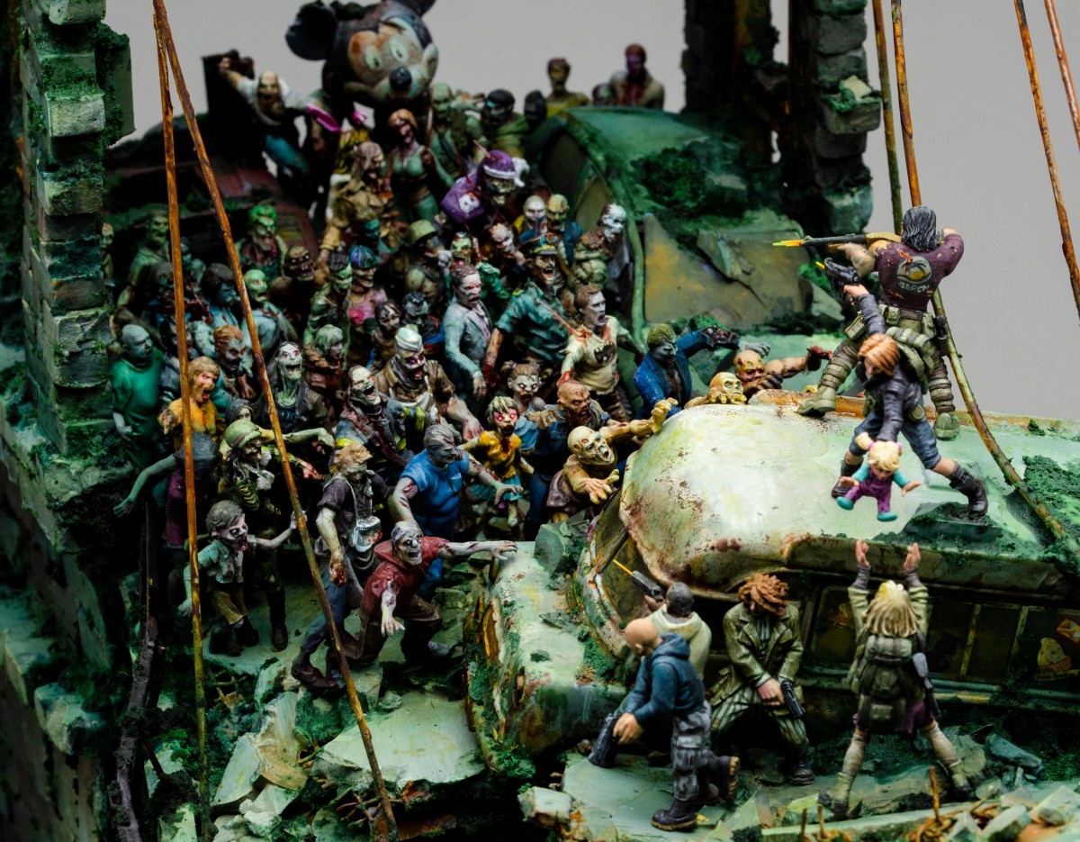 Was ich an diesem Diorama so toll finde ist, wie das Auge durch die Farbgestaltung gelenkt wird. Das warme „Licht“ und der starke Kontrast setzt die Überlebenden in den Fokus. Dagegen wird das Gefühl der unüberwindbaren Masse an Zombies noch mehr durch die kalte Farbgebung verstärkt. Erst bei genauerem Hinsehen kann man dann die gesamte Detailverliebtheit bei den Zombies erkennen.