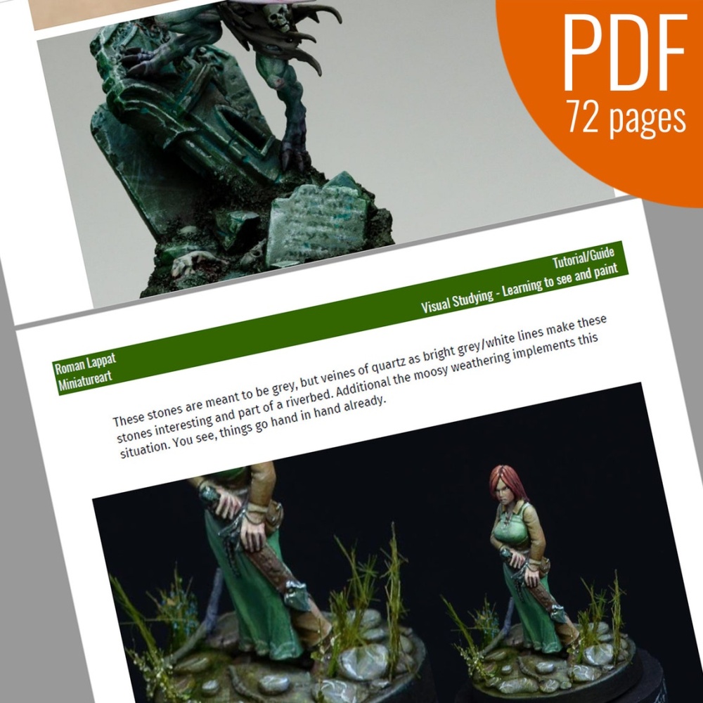 This digital PDF-Tutorial (72 pages) is not about painting with recipes. It explains to you how you can train your eyes to read nature and how to transport this knowledge to your (miniature) painting. You will learn recipes from nature.