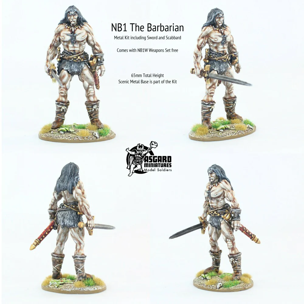 When assembled the Barbarian is 65mm to the top of its head and it is 54mm scale. Parts comprise the Barbarian, a base (with plugs for feet), a sword and a scabbard. Sculpted by Nick Bibby.