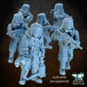 First up, we’ve got the Hazmat Team in heavily rubberised suits and full rebreather gear, with a big oxygen tank on their backs too! Lots of little details around the belt, including sealable specimen vials and pouches. The electrostatic chemical sprayer is an optional build, and the body holding it is provided as a stand-alone version, for 5 complete and unique Hazmat bodies!