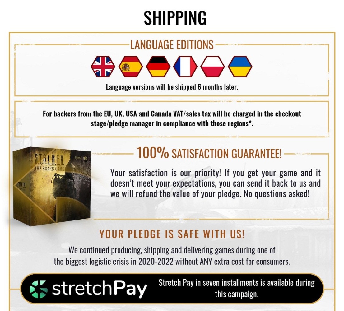 This gets you one copy of S.T.A.L.K.E.R. The Board Game plus all unlocked Stretch Goals + the Zone Threats add-on. You can choose the language version of the game and the grey or Sundrop version of the miniatures.