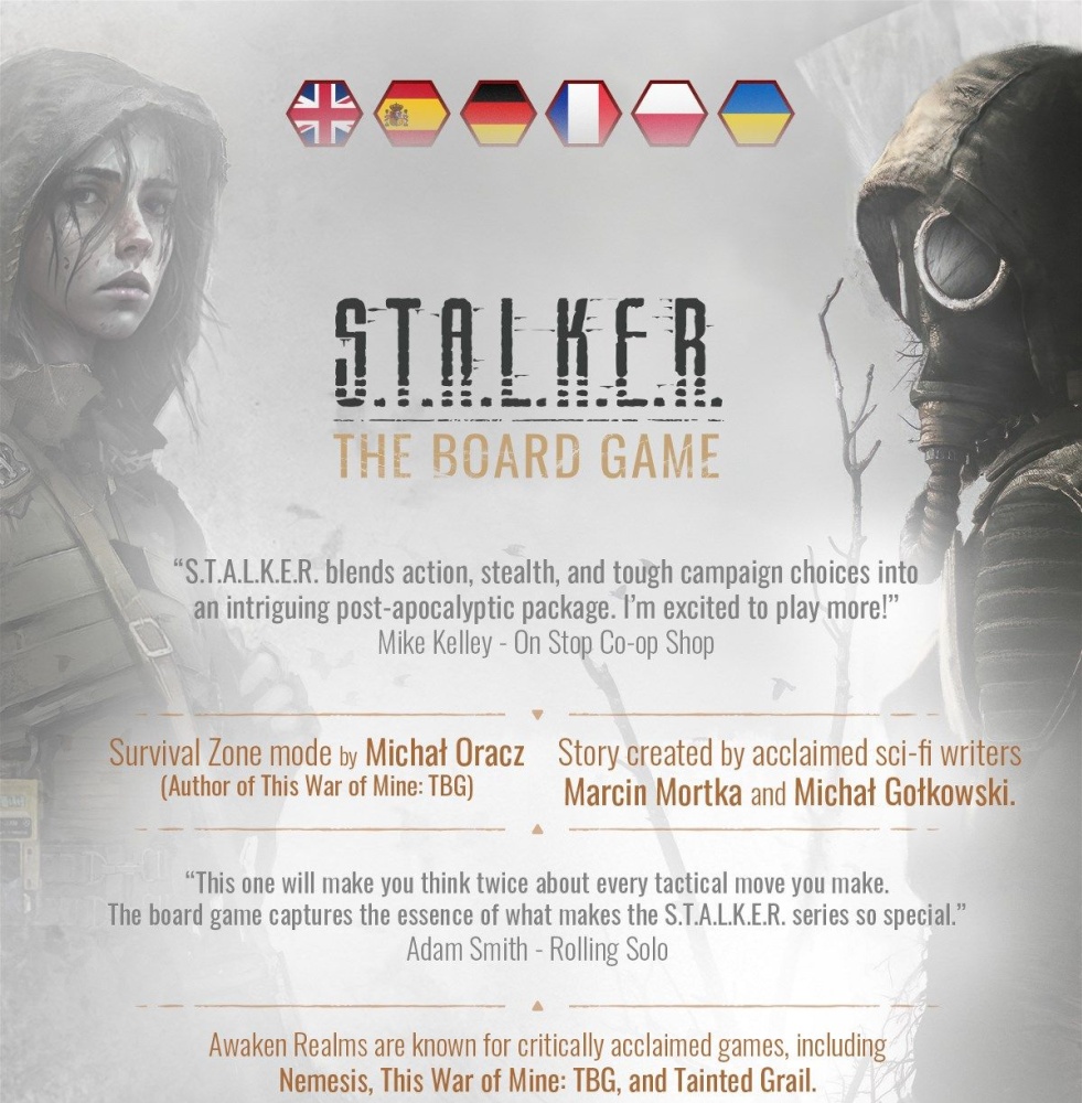 S.T.A.L.K.E.R. Board Game is a 1-4 player fully co-operative, story based “zone” crawler. It is set in alternative version of Chornobyl Nuclear Plant Exclusion zone, full of anomalies, relicts, mutants, emissions and dark secrets. Chose your asymmetric stalker, customise your gear and prepare for exploration – remember, every bullet cost you money!Every mission will offer a different approach – either sneak in, or go in guns blazing. Both systems are integrated seamlessly, into a highly tactical experience that will leave you on the edge of your seat. But you always have to remember, that Zone is full of surprises – toxic radioactive rain, upcoming emission, anomalies or bands of mutants roaming around can cross your plans. Luckily, it also affects bandits and gangs – they can be attacked but mutants just as much as you!Prepare for an amazing, grimdark adventure with a lot of hard story decisions to make. You can play S.T.A.L.K.E.R. either in campaign mode or Zone Survival mode, one-off session full of surprises and unscripted adventures. Campaign mode is divided into 3 separate chapters, each 10-12 hours, making it very easy to bring to the table and complete – while telling a great story of mysterious transmission that just started broadcasting around the whole Zone.
