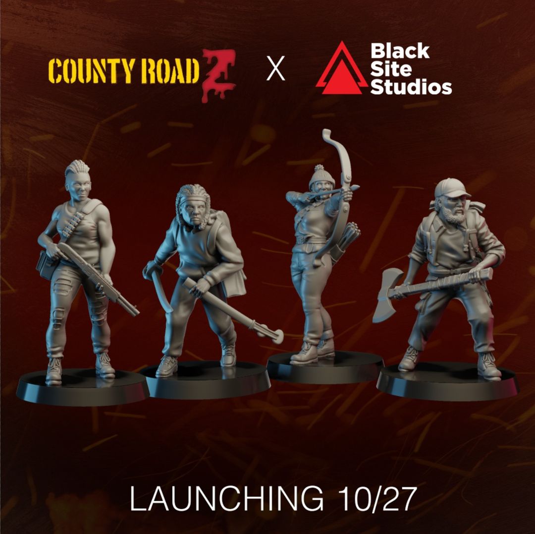 We’re thrilled to unveil a brand-new collaboration that’s been brewing behind the scenes. Black Site Studios and Earthbound Games have joined forces to bring you something truly special – an official set of 4 survivor miniatures for County Road Z!These are based on 4 existing characters from the County Road Z lore and are the perfect way to support one of our favorite solo Zombie games![EARTHBOUND GAMES JORDAN – „I’ve been a big fan of BSS for years, so seeing their designs for County Road Z has been a dream come true!“]These resin miniatures will be released for preorder on 10/27Special thanks to Steve May for sculpting these up!