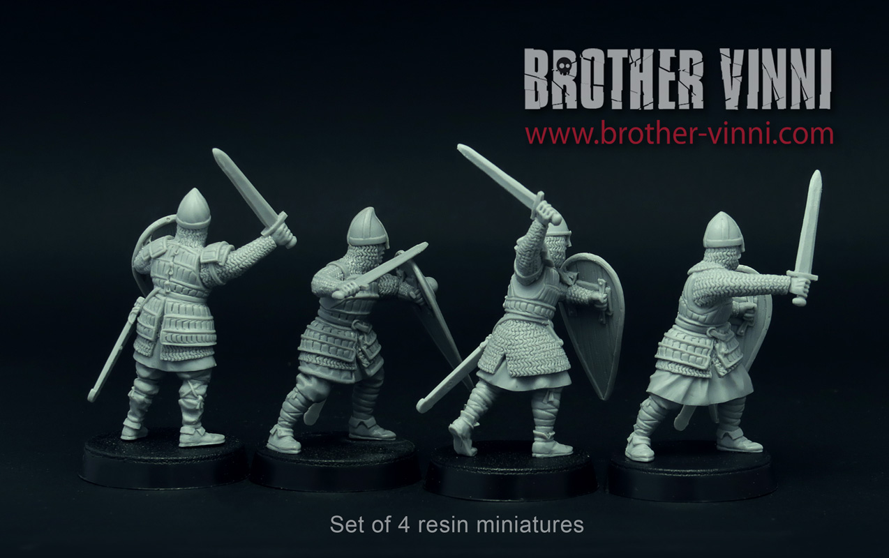Italo-Norman miniatures (28 mm miniatures). The set of 4 high-quality resin miniatures depicts Normans on South, they are armed with swords and typical drop-shaped shields. This set would be a good addition for any SAGA warband or just for playing fantasy wargames. Miniatures designed and casted by Brother Vinni’s studio.