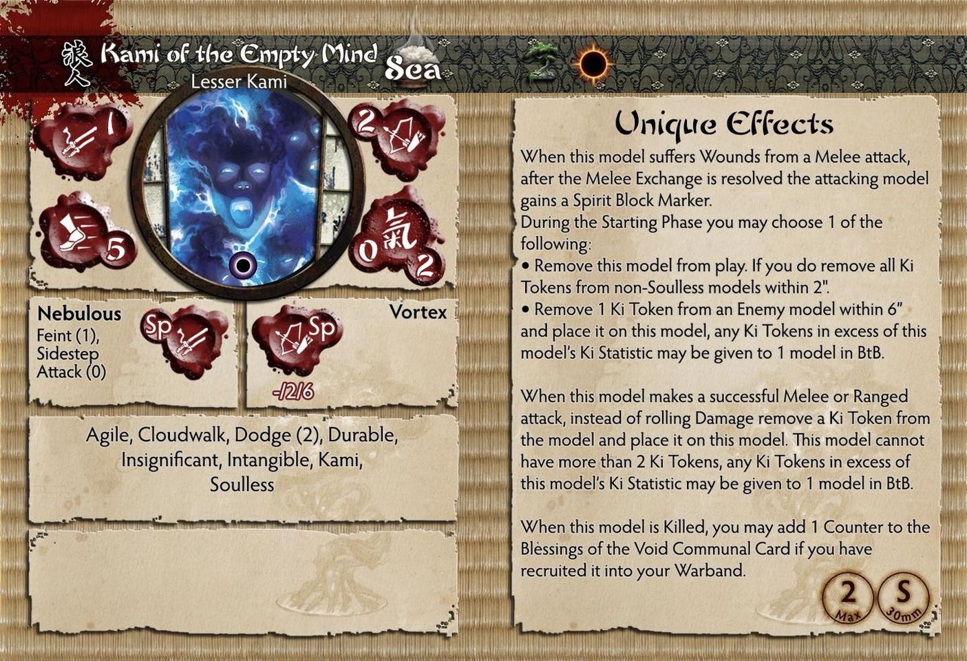 Kinshi and Rokan players have been waiting a long time for this model. Indeed, it was first written in 2015! Kinshi Players will know it has many synergies with various Kinshi models, including replacing the Husk when killed. It can also accelerate the collection of Void Counters. In a Rokan Warband, it helps keep Monks topped up on Ki. For both Factions, the Kami can steal Ki Tokens from the enemy, hampering their ability to use their abilities. Doing this at both melee and ranged attacks gives this Kami many options and is a must-buy for Righteous Warriors players.