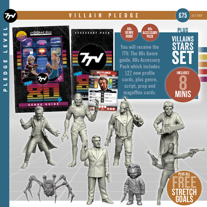 You will receive the new 7TV: The 80s Genre Guide, Accessory Pack and Profile Cards (RRP £55). PLUS BOTH Heroic and Villainous Stars Miniature Sets (containing 16 miniatures, RRP £64). PLUS you will receive ALL stretch goals in the campaign both FREE & PAID-ONs (RRP £125+)!