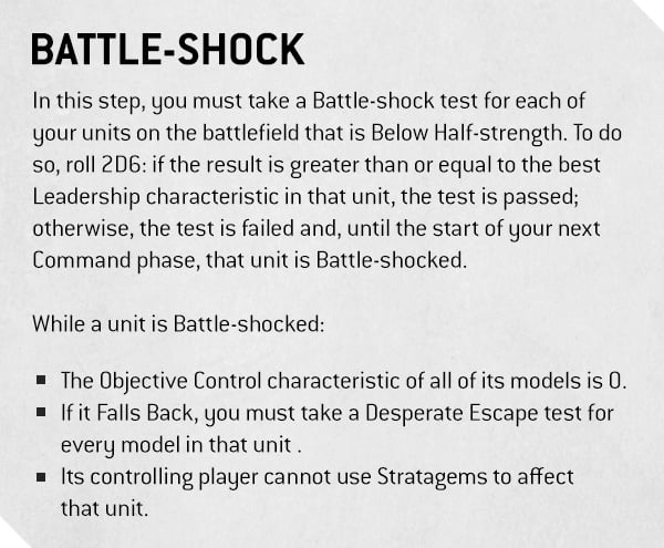 Battle-shock tests are super simple. Roll a 2D6 for every unit that’s Below Half-strength – that means they’re a squad with less than half of their starting models, or a single model with less than half of their starting Wounds. You’ll need to roll equal to or above your new Leadership characteristic – if you fail, that unit suffers some nasty penalties until your next turn.
