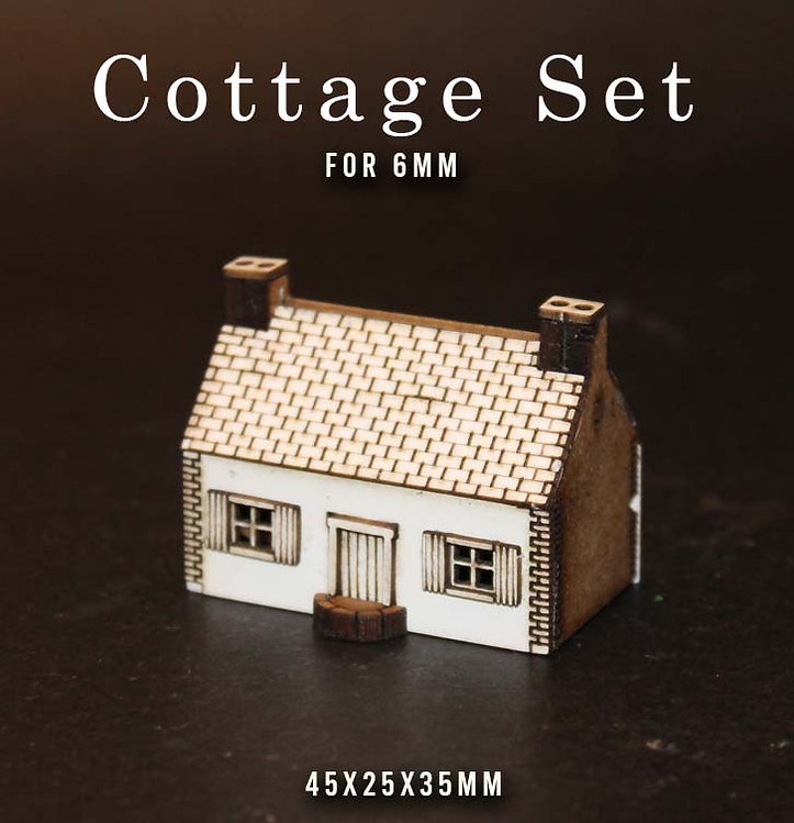 This set contains 4 different cottage for 6mm tabletop games. This kit has MDF and cardstock materials.