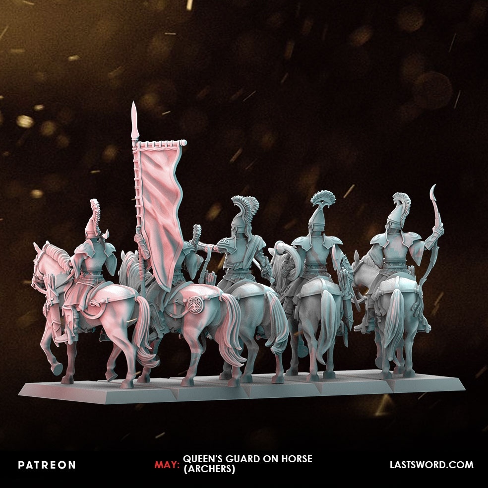 Regarding the units, this month we have a double cavalry. They are in a more relaxed position to serve as an escort for the Queen. We have designed them without a base so that you can use them as either Light Helmets or Reapers with a bow.