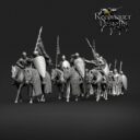 Here’s Alfonso IX, King of León, representing him and his retinue marching enroute to meet the rest of his army on campaign against the Moors. Along with his standard bearer, their squires, two mounted sergeants, 3 spearmen, 2 crossbowmen, 2 friars, 2 gaiteros (bagpipers), and a lute player!