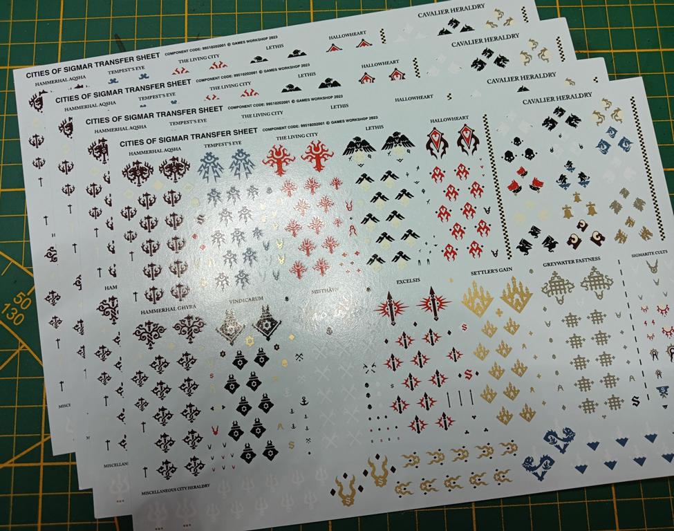 Zuletzt werfen wir einen kurzen Blick auf die sonstigen Inhalte der Box. Enthalten sind Schriftrollenkarten, Verbesserungskarten und Markerbögen für die Cities of Sigmar und eine edle Version des Kriegsbuchs mit Goldschnittverzierung. Ebenfalls enthalten sind vier Kopien eines Cities of Sigmar Transfersbogen.