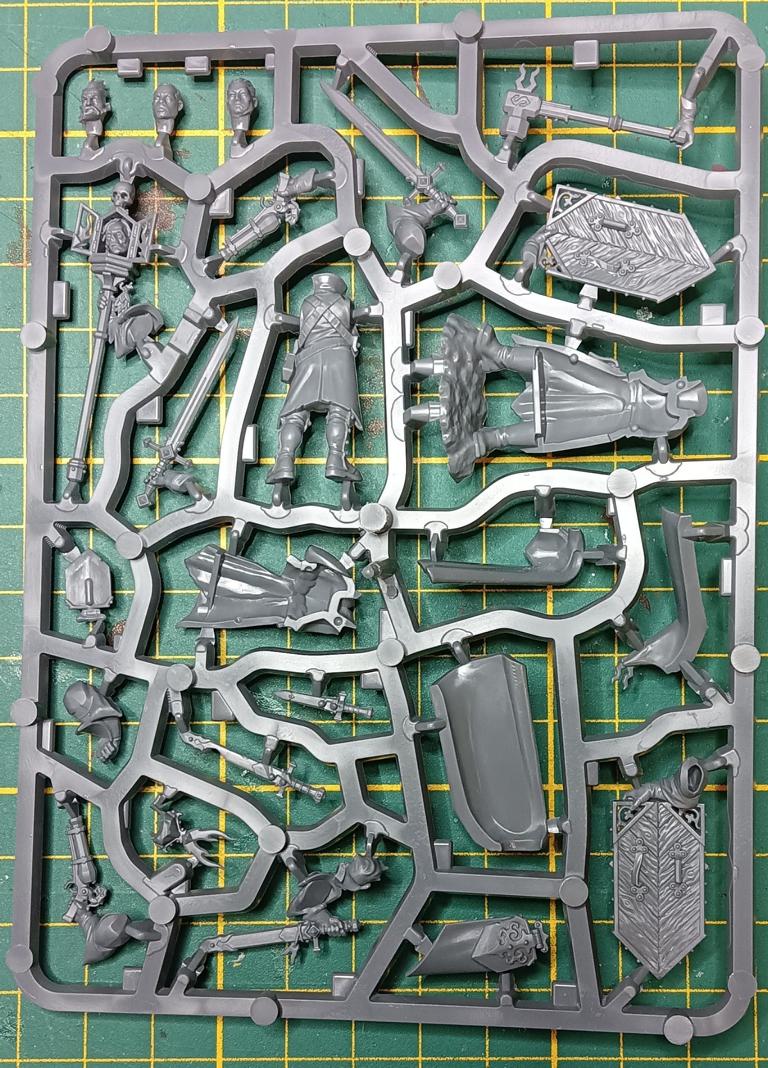 Der Marschall und sein Reliquienbote teilen sich einem Gussrahmen. Für den Marschall selbst sind jede Menge Bauoptionen enthalten. So kann man für ihn zwischen drei Kopfoptionen entscheiden und ihn entweder mit Langschwert, Kriegshammer oder Duellpistolen bauen. Bei Hammer und Schwert hat man weiterhin die Möglichkeit ihn mit oder ohne Schild zu bauen. Wo der Marschall vor Optionen strotzt, schwächelt sein Reliquienbote. Denn dieser kommt nur in einer Monopose daher.