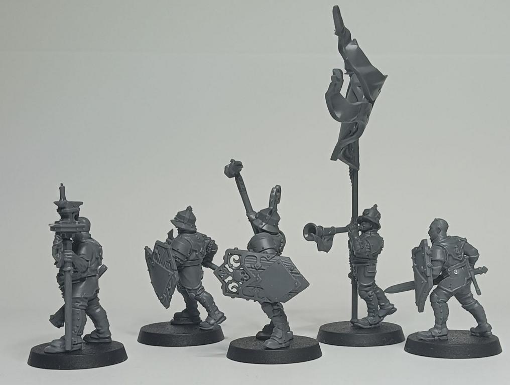 Von links nach rechts (Alle Miniaturen sind von Games Workshop): Freigilden-Stahlhelme Kriegspriester, Imperialer Schwertkämpfer, Freigilden-Stahlhelme Champion, Imperialer Bihandkämpfer, Freigilden-Stahlhelm, Primaris Space Marine