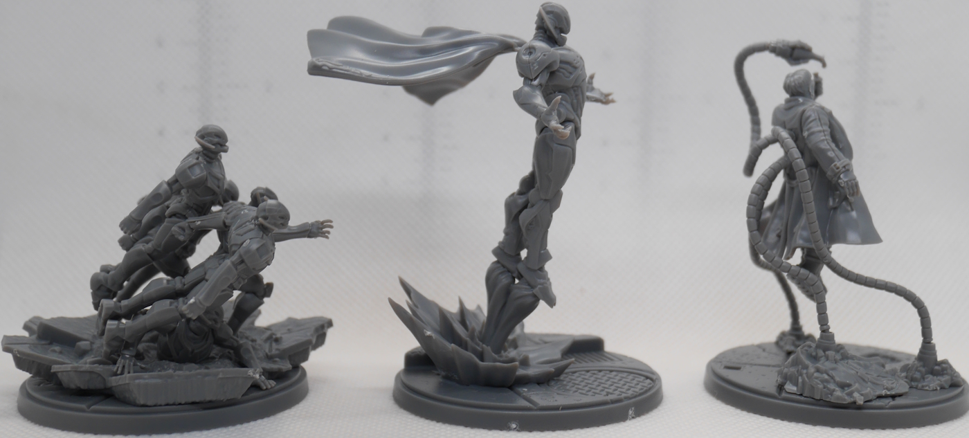 Die Figuren überzeugen durch sehr dynamische Posen die die Modelle größer wirken lassen als sie sind. Gerade bei Spider Man habe ich um die Spinnenfäden und Venoms Zunge etwas Angst wenn ich die Figuren transportieren werde – das Plastik ist allerdings etwas federnd, so dass die Teile nicht beim Anfassen auseinanderbrechen werden. Der Gusskontrast und die Hinterschneidungen sind sehr gut, Gussgrate selten an problematischen Stellen.