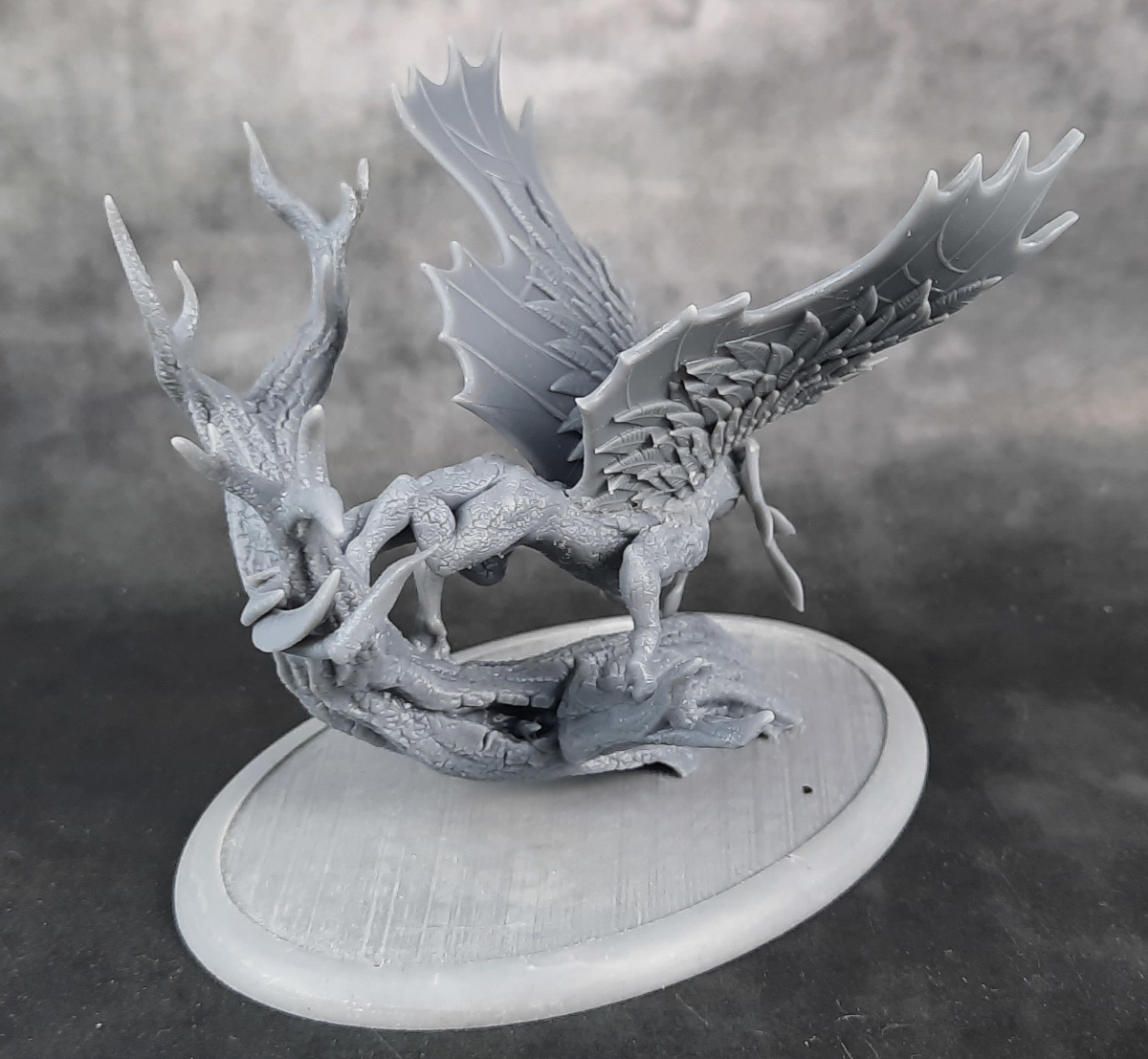 Viel zusammen zu bauen, gibt es beim Schimmerdrachen nicht. Der Drache selbst besteht nur aus zwei Teilen und noch die Base dazu. Da der Schimmerdrache gedruckt wurde muss man hier und da noch etwas Supportreste entfernen, aber die meisten wurden schon vom Hersteller entfernt. Mit Sekundenkleber bekommt man die Teile schnell geklebt.