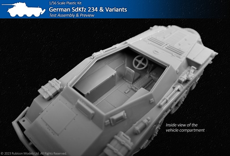 Test assembly and a preview of our version of the German SdKfz 234 and Variants – the choice to build an SdKfz 234/2, 234/3, or 234/4. You can also make an SdKfz 234/1 with the Hängelafette turret using our 280048 expansion kit (sold separately)! There is an „EXTRA“ Hängelafette turret that is not used in our SdKfz 222/223 Light Armoured Car (280062) kit too. Please note SdKfz 234/4 is not shown.