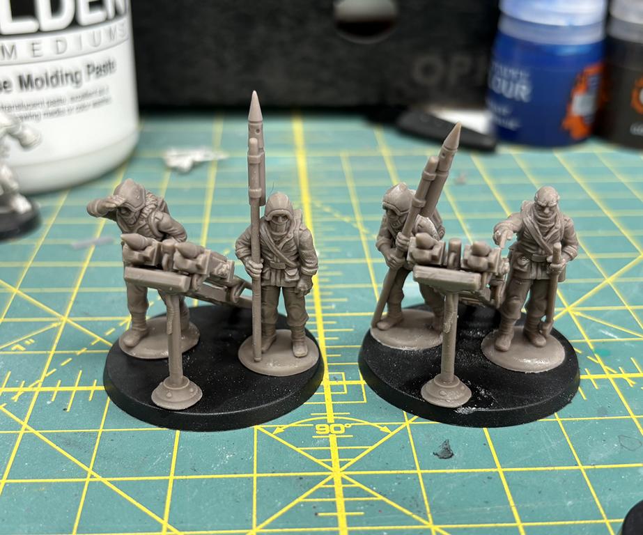 Arcanists are key battlefield enchanters whose spells are key to victory. Expand your shock troops with three additional poses equipped with pistols and hand weapons. Rocket batteries are powerful artillery pieces that lay down waves of explosive fire from long ranges. Rockets are special units only available to Imperial battalions.