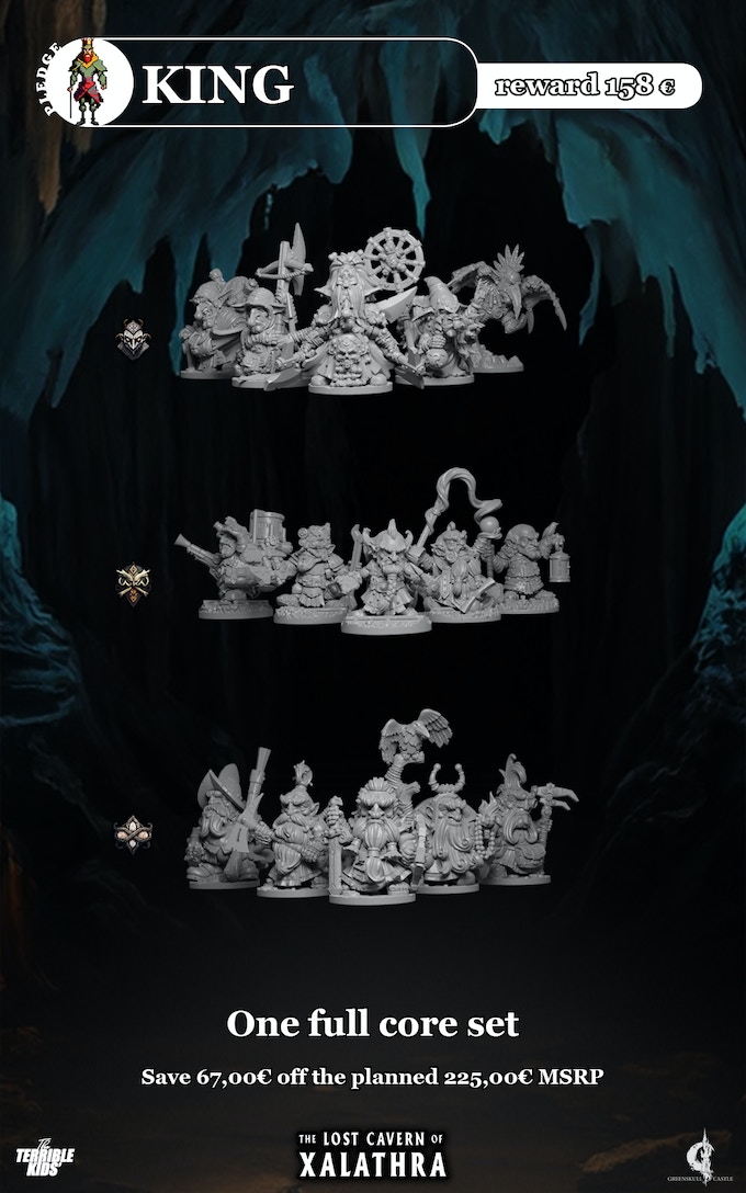 If you’d like to purchase one or more goblins or dwarves or gnomes from the core-set add 12,00€ per character on top of your pledge (exclusive offer for this campaign).