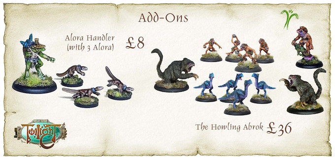 There are a variety of add-ons available, mainly giving you access to all the individual bits from the campaign, but also including a few bits from the webstore that will be useful for the scenarios (Howling Abrok) or that fit the theme (Alora Handler). Kickstarter now allows you to include add-ons with your pledge, which should make pledge management a lot easier!