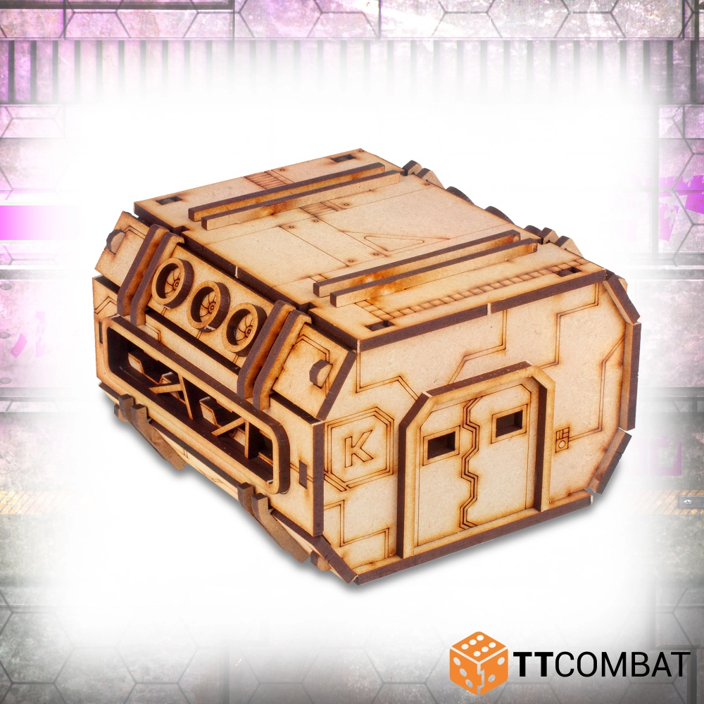 This kit is made from 3mm MDF. It is a great piece of scenery to use on the tabletop it is suitable for 28-32mm scale miniature games. It is also entirely modular and interchangeable with all the other Prefab buildings in the Sci-Fi Utopia range.