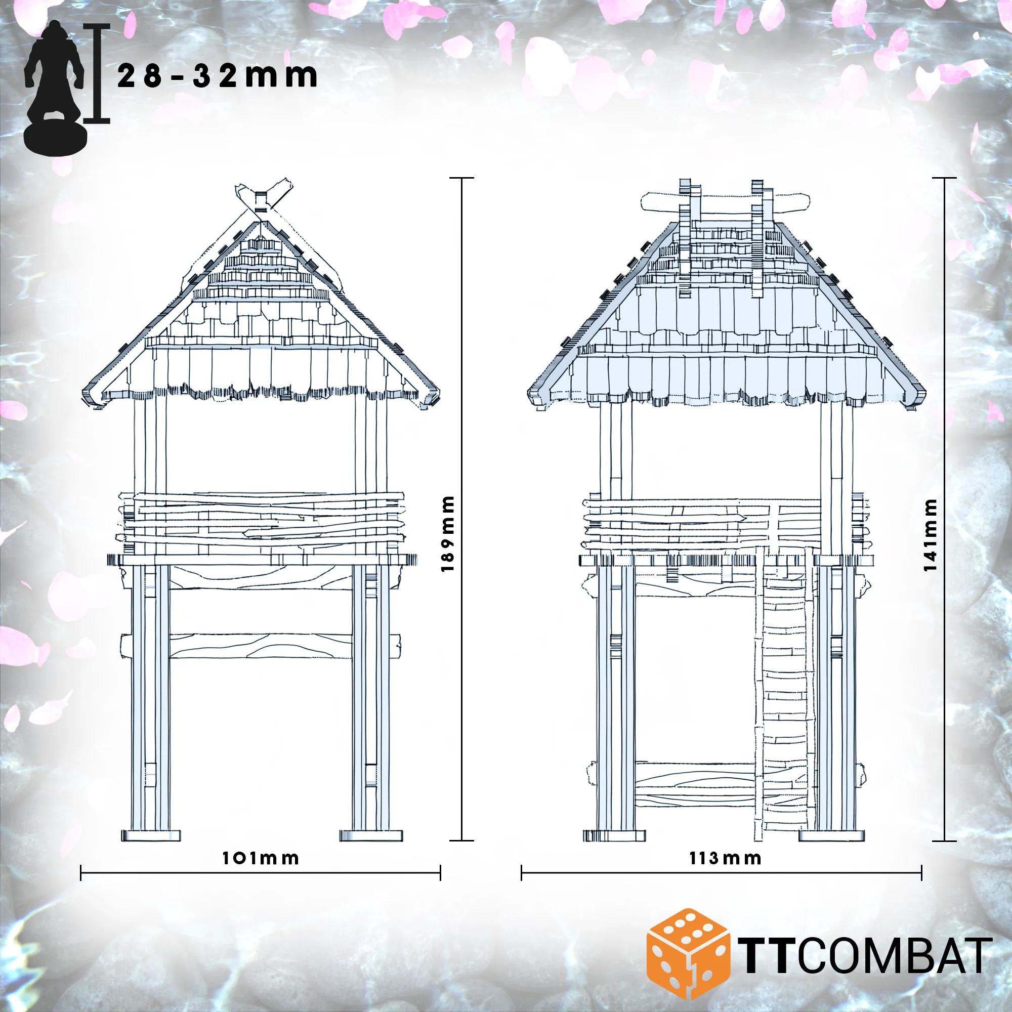 This kit is made from 3mm MDF. It is a great scenery kit to use in Fantasy skirmish games, will work perfectly with 28-32mm games and miniatures and look great on an Eastern Inspired rural game board.