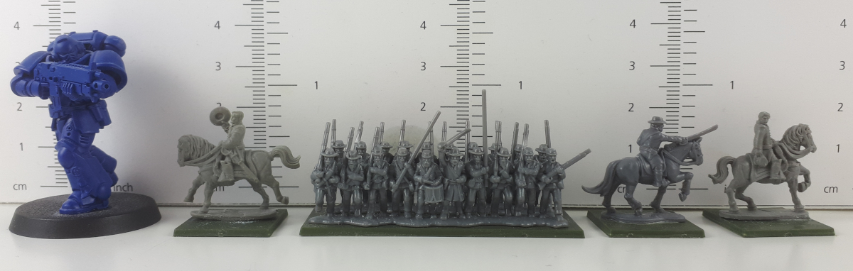 Ich habe allgemein von den Fotos her den Eindruck, als seien diese namhaften berittenen Generäle etwas größer skaliert als die Infanterie, jedenfalls war der Grant trotz zum Reiten angewinkelter Beine und abgenommenem Hut beim Nachmessen etwas höher als die in Linie marschierenden Soldaten. Das finde jetzt aber nicht so problematisch, weil die Generäle so wenigsten auffallen.