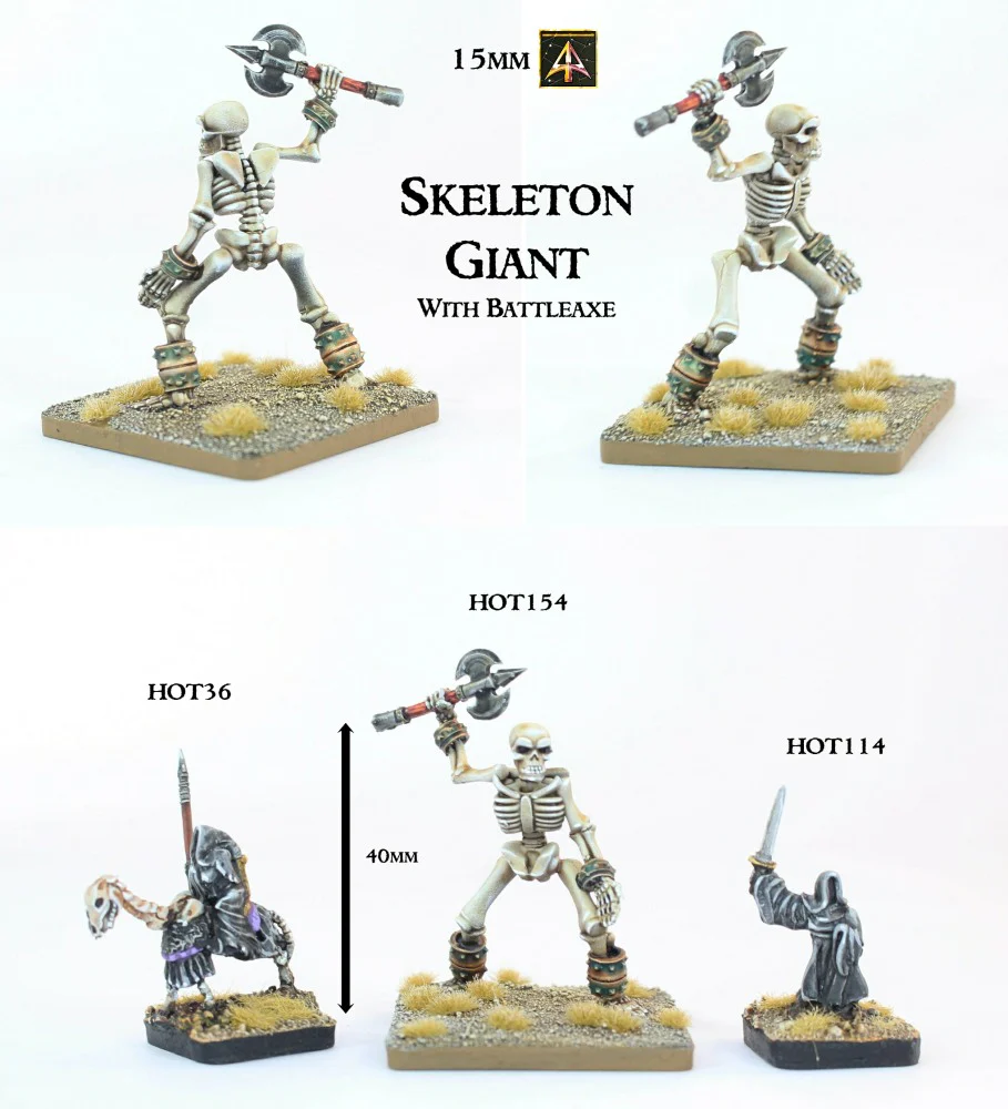 The mighty HOT 15mm Fantasy Range adds its one hundred and fiftieth fourth code and to give it its due it’s an Undead release of some height. A new Skeleton Giant with battleaxe; a behemoth to lead your horde of Skeletons, Zombies, Mummies and others in a game system of your choosing.