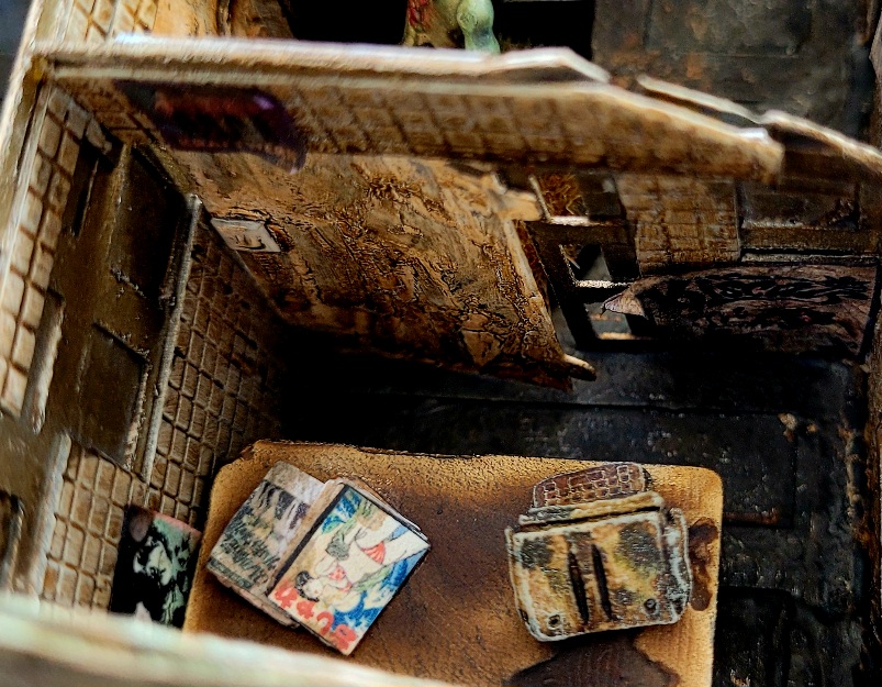 In meiner Interpretation soll die Figur in sich stark verwittert sein. Gerade im Vergleich zu den Gebäuden erkenne ich da die gleiche Technik bei der Bemalung des Metalls.