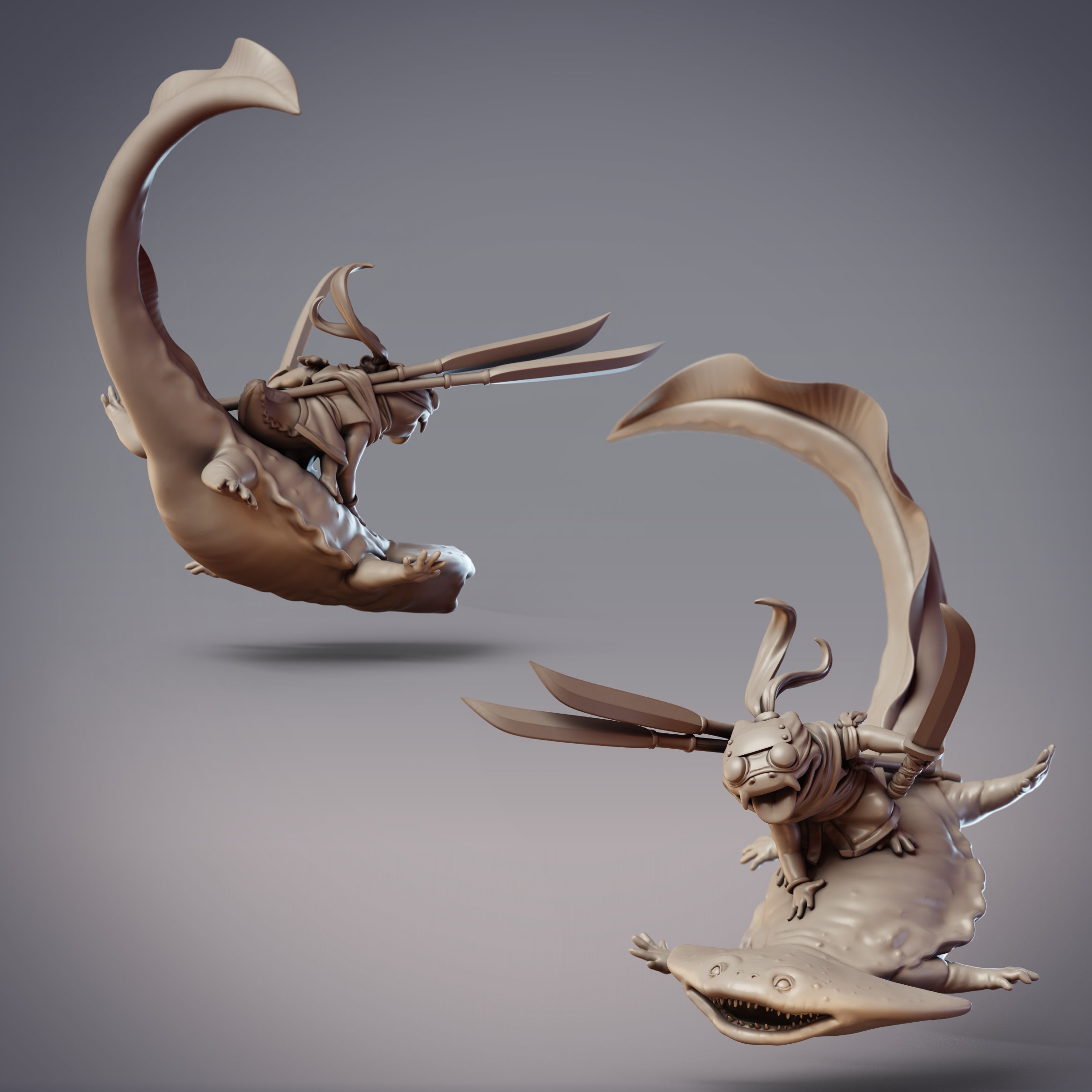 With its distinct spade-shaped head and overall flat body, the Diplocaulus makes for a great mount in the mud-and-water environs of the Mikata Wetlands. Able to cut through the water, float on top of mud and quicksand, and scramble through tangled vegetation, it’s the ultimate all-terrain vehicle. Their brains are extremely primitive however; while they can be trained as effective mounts, they can, at times, have surprisingly delayed reactions to common stimuli like danger or food and thus are not good at protecting themselves or their riders.