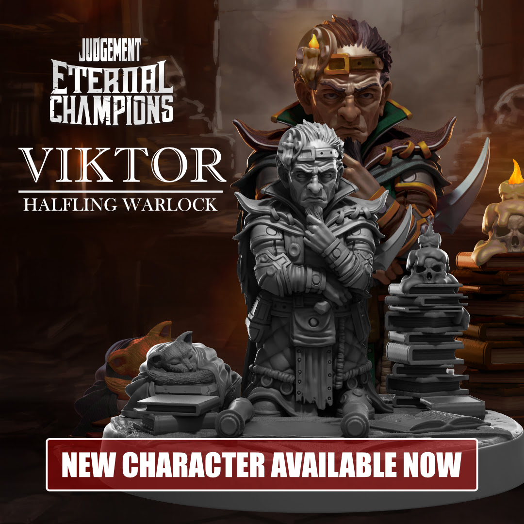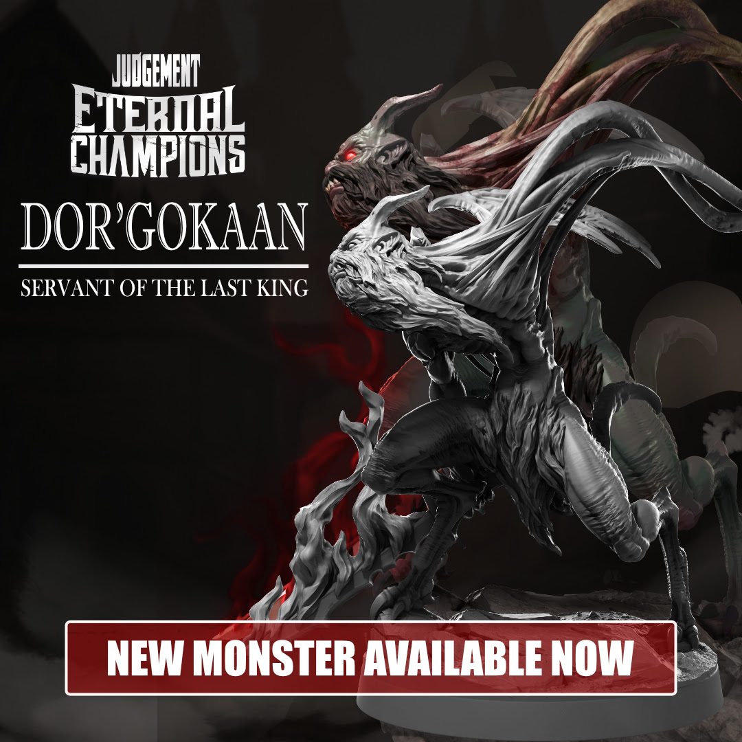 Joining the ranks of the highest tier of monsters, Dor’gokaan adds a fun and new dynamic to any game of Judgement. Dor’gokaan hunts those who carry souls with terrifying efficiency. Any hero that is not outright slain by his blade may be cursed by his blade. Those out of reach of his cursed blade, he weakens with his malignant gaze. Those bold enough to banish him, will be given the chance to wield the demon blade, an artefact that holds tempting power, at a terrible price. Also, Dor’gokaan, like his smaller cousin Al’galrath, can be summoned by his halfling master, Viktor. With his destructive melee and magic attacks, and his ability to fly across the battlefield, he will reap souls for those who are foolhardy enough to harness his power.