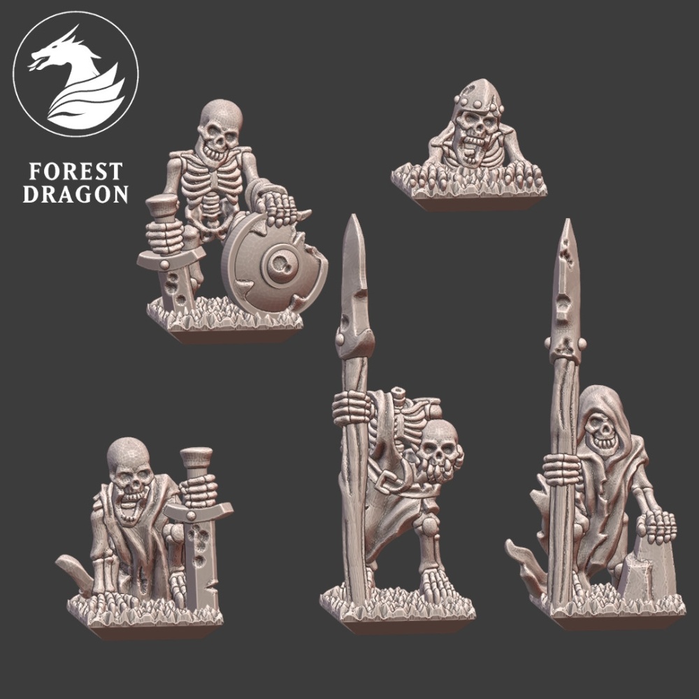 The 3 strips of freshly raised skeletons are intended to be mixed in with the previously released light skeleton infantry to add some more variety to your shambling hordes. As before, these print entirely support free, and individually based skeletons are also included.