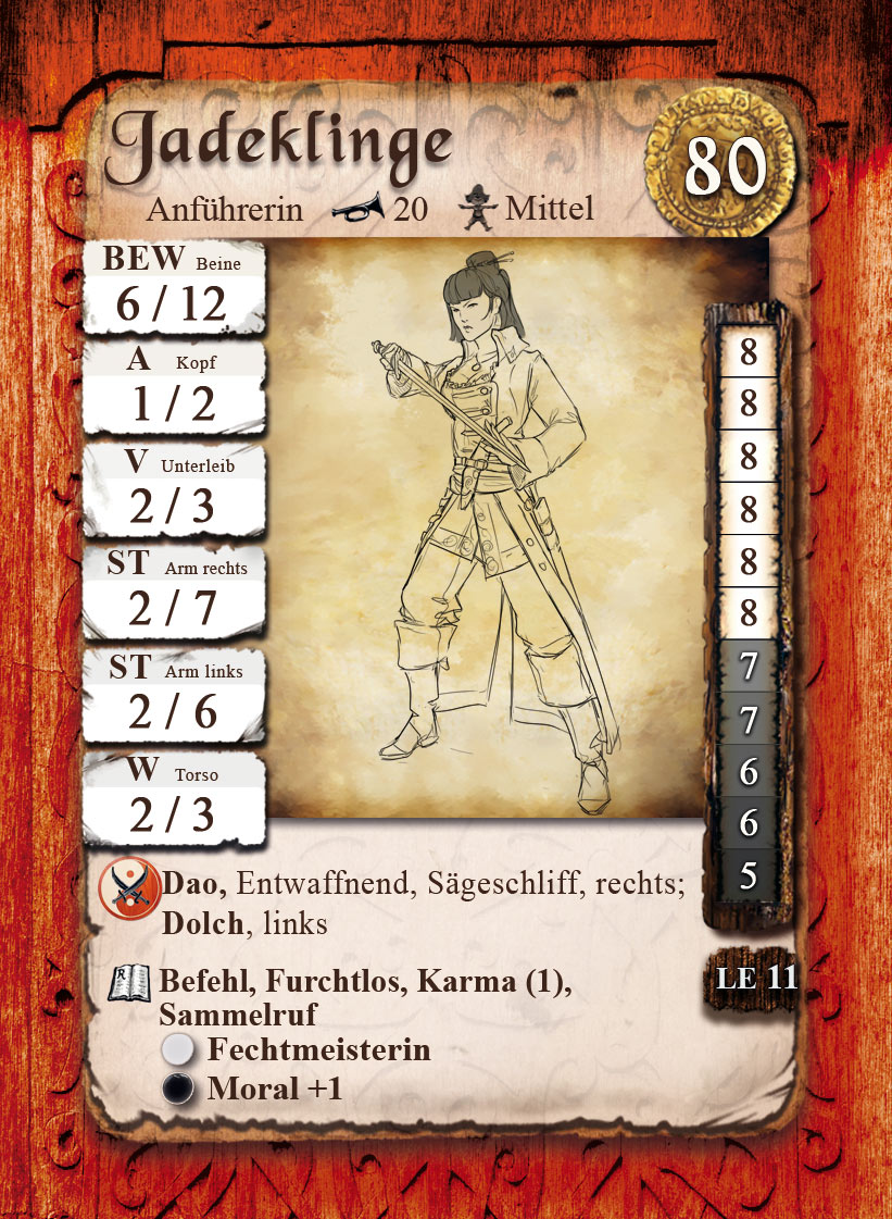 Als Beispiel: Jadeklinge, die Anführerin aus der Starterbox, muss mindestens zwei Gefolgsleute anheuern. Ist das geschehen, können die restlichen Dublonen beliebig in Spezialisten oder Gefolge gesteckt werden.