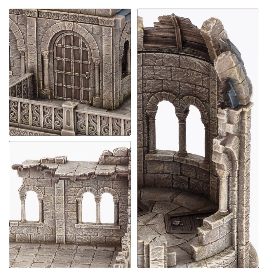 Das Herrenhaus von Gondor – ein prächtiges Bauwerk, das das Können der Steinmetze des Königreichs zur Schau stellt und das über mit Eisen verstärkte Holztüren und kleine Details wie die atemberaubenden Filigranarbeiten am Balkongeländer verfügt. Seine Torbögen wurden mit Blick auf die Miniaturen gestaltet und erlauben es Infantieremodellen, sich einfach durch sie hindurch zu bewegen und im Inneren zu kämpfen, während Modelle mit größeren Bases wie Monster und Kavallerie dies nicht können. Das Dach des Herrenhauses kann ohne Kleber zusammengebaut werden, damit du es während des Spiels abnehmen und in seinem Inneren kämpfen kannst.