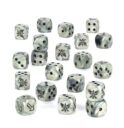 20x graue, perlmuttartig verwirbelte Würfel mit schwarzen Zeichen und einer Kantenlänge von je (16 mm), darunter: