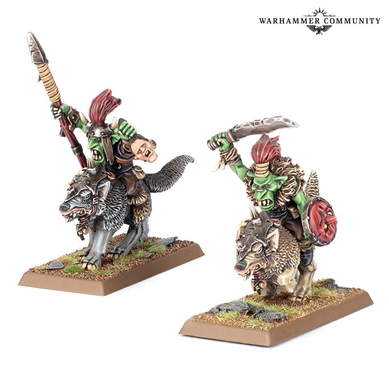 Seven classic packs of Goblins also return! In metal, there are packs of four Night Goblin Bosses,****three Night Goblin Shamans, three Goblin Bosses, two Goblin Shamans, and three Goblin Nasty Skulkers. In metal with plastic wolves, there’s also a pack of two Goblin Wolf Rider Bosses, and the Goblin Wolf Chariot – the chariot also has plastic wheels and a selection of paper banners.
