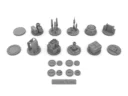 This set of 12 themed tokens are 2-inches in diameter and include bunker entrances, communication towers, checkpoints, stockpiles of goods, laboratory equipment, and two basic tokens for simplicity or additional hobbying. Included as a bonus are various red/blue player tokens and a 3-inch ruler.