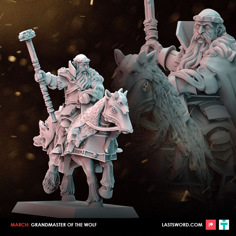 Then, the unit of foot knights, with one-handed weapons and shields, and two-handed weapons. The unit can be assembled in the traditional way, but what really makes it spectacular is the scene where one of the knights is being blessed by a Priestess of the Sun in the moments before battle.To conclude the month, one of the characters we had pending. The Master of the Knights of the Wolf. In the render, he still has the small hammer, but at your request, we’ve increased the hammerhead by 15%.