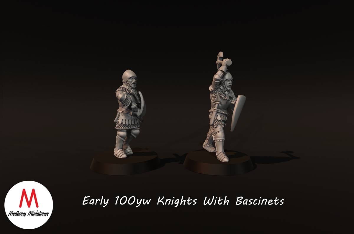 So the first 2 kits to show off are 2 packs of knights, 1 set with Basinets, 1 with modular great helms, all 4 knights are equipped with hand weapon and shield, 1 which is already attached, the Great helmets are modular because the neck joint is hidden, this will be the standard going forward for knights with great helms, these knights are very much intended to be early 100YW, with the Shorter Surcoats and more plate then other knights we have done before,