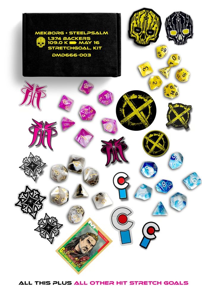 The Ammo Box is the ultimate swag box for MEKBORG and STEEL PSALM. It serves as a catch-all for all the stickers, patches, enamel pins, dice sets, zines, and whatever the hell else we decide to throw into this thing. It will automatically get all physical stretch goals. The starting pack comes with everything you see there. We will add more to it as stretch goals are unlocked and won’t increase the price as we do.