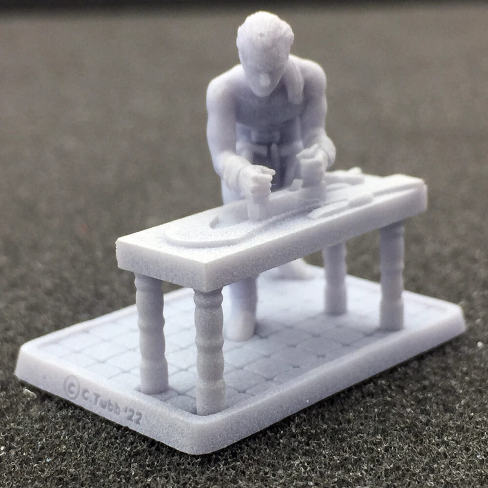 Only 100 of these figures are produced at this time. This is the 204th release in the Gold Status Fellowship club. This was the winning idea from March 2023 and was submitted by Fellowship member „ddaines„. This is the sixteenth fully resin release, undercoated with matt grey primer. The figure comes in three pieces, the base, the workbench and the Elven figure. The base has the manufacturer name MITHRIL, the sculptor’s name and creation date and MZ number on the sides of the base.